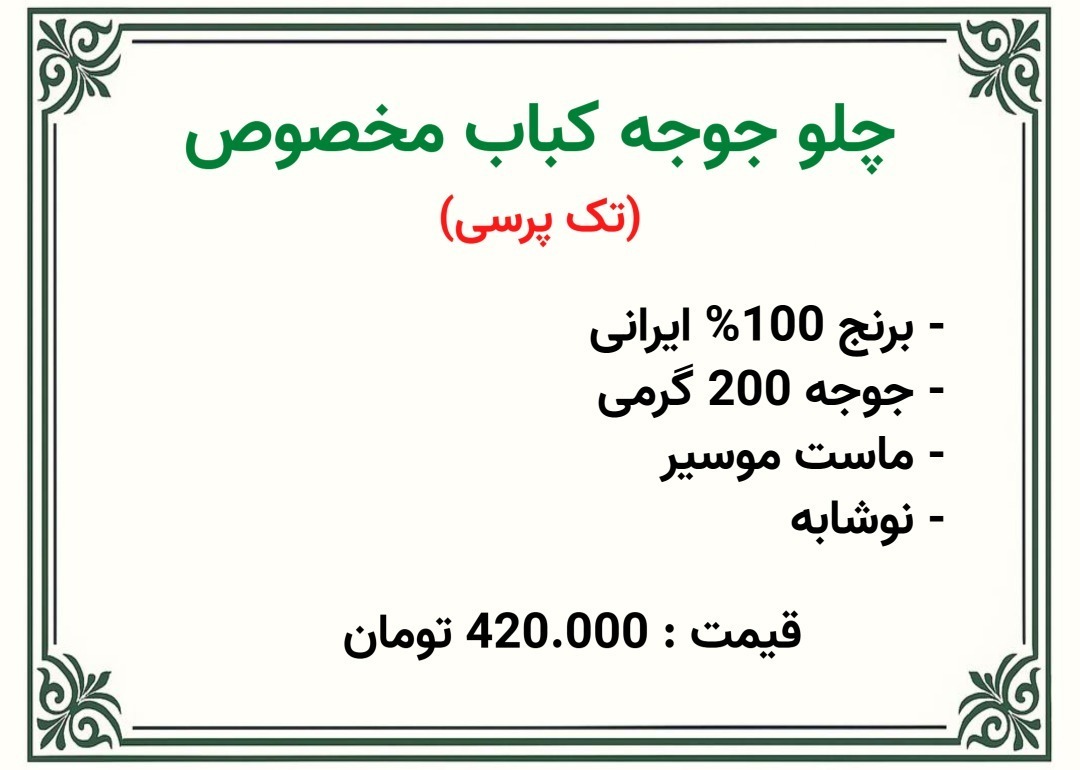 این تالار لوکس در اتوبان هاشمی(جاده بهشت زهرا) در مسیر برگشت به تهران واقع شده است. نزدیکی به بهشت زهرا(3دقیقه) از نکات مثبت این تالار برای صرف ناهار مراسمات ختم و ترحیم میباشد. با وجود منو اقتصادی، متوسط و لوکس نظر مثبت بسیاری از کاربران وبسایت ترحیم هجران را همراه داشته است.
